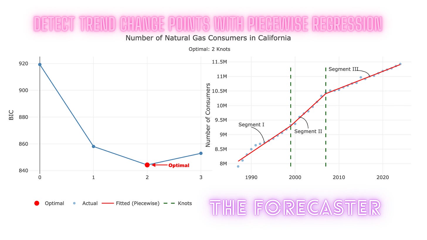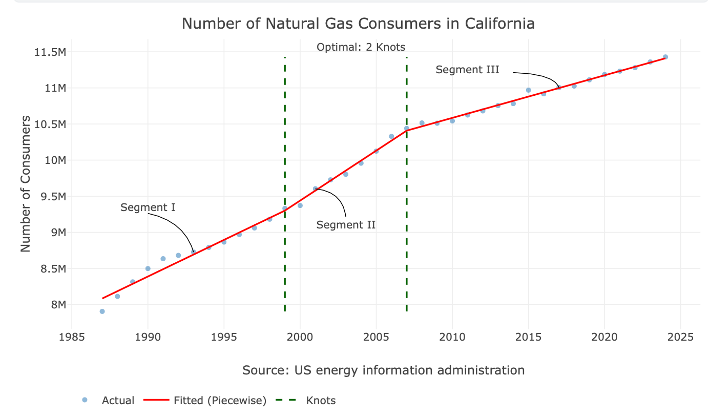 The example used in that tutorial—the number of natural gas consumers in California—was intentionally simple. The change point is visually apparent, making it a good teaching example. In real-world scenarios, however, trend changes are often subtle, noisy, or numerous, and identifying them visually is neither reliable nor practical. This becomes especially problematic when working with dozens or hundreds of time series.