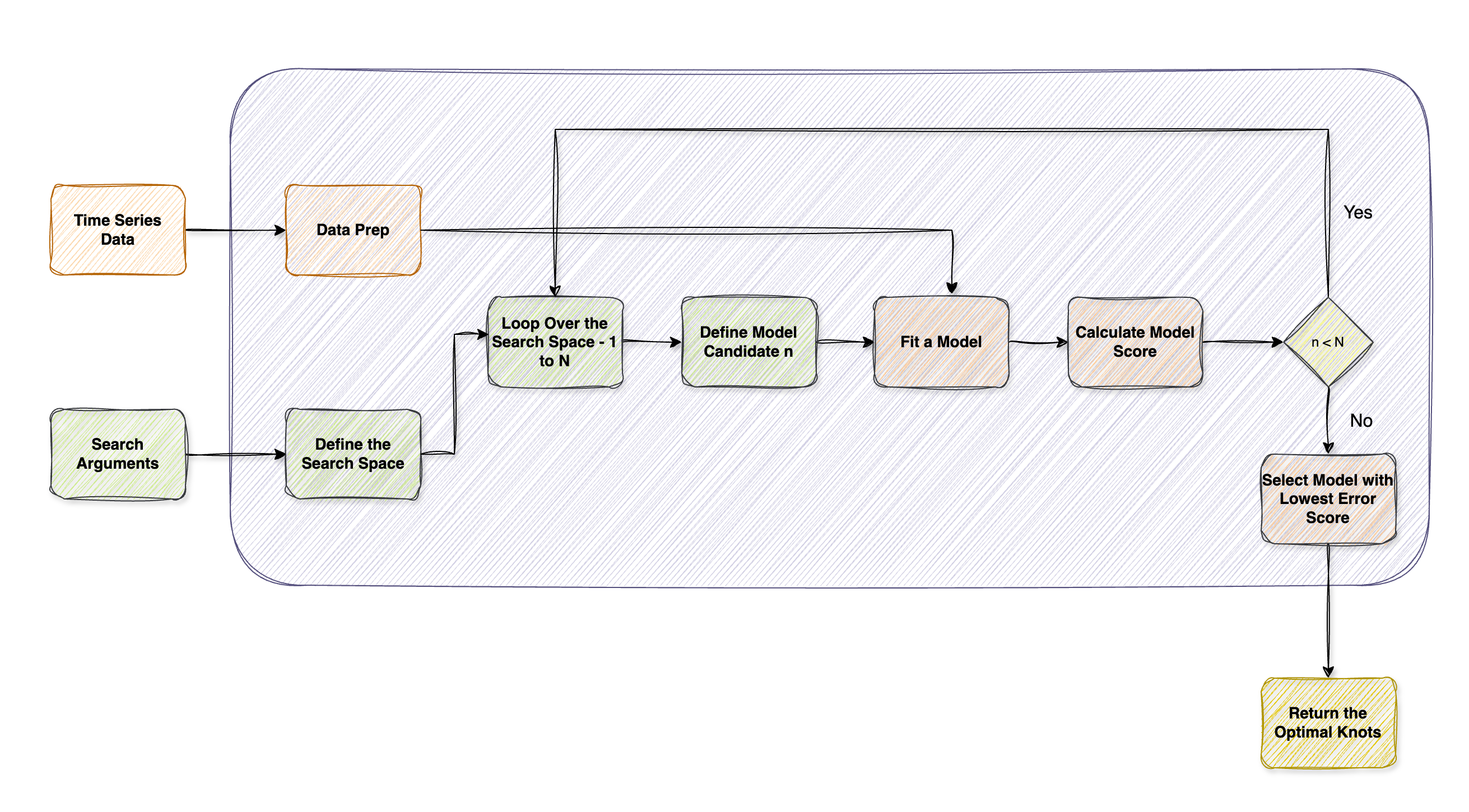The inputs to such a function are the time series and the search space arguments, and the output is the optimal set of knots.